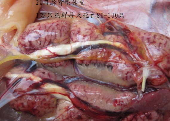 解剖癥狀:腎臟高度腫脹、蒼白,腎小管和輸尿管變粗,內(nèi)充滿白色尿酸鹽,俗稱“花斑腎”,嚴(yán)重者在心包、肝臟、腸道表面有白色霜樣物沉積。泄殖腔內(nèi)充滿白色石灰樣稀糞;病程較長(zhǎng)者,繼發(fā)大腸桿菌和支原體感染,形成氣管炎、肝周炎等敗血癥變化