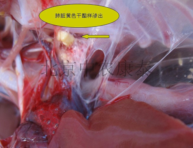 出現(xiàn)喘式呼吸,嚴重時出現(xiàn)蛤蟆叫聲,使用常規(guī)抗菌素治療無效,肺臟出現(xiàn)特征性纖維素性滲出,肉雞后期繼發(fā)腹水癥;產(chǎn)蛋雞出現(xiàn)產(chǎn)蛋下降。