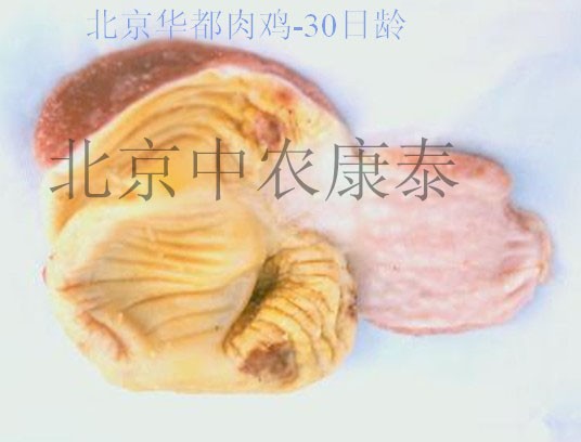 1、臨床癥狀:14-30天雞群普遍拉黃色糞便,食欲部振,喜食飼料細末,生長緩慢,死淘率低。料肉比高,達到2.3:1或2.4:1