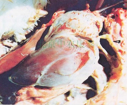 剖檢時(shí)可見鼻腔、氣管、支氣管和氣囊中含有粘液性滲出物,特征性病變是全身氣囊特別是胸部氣囊有不同程度混濁、增厚、水腫,隨著病程發(fā)展氣囊上有大量大小不等干酪樣增生性結(jié)節(jié),外觀呈念珠狀,少數(shù)大至雞蛋,有的出現(xiàn)肺部病變。在慢性病例中可見病雞眼部有黃色滲出物,結(jié)膜內(nèi)有灰黃色似豆腐渣樣物質(zhì)